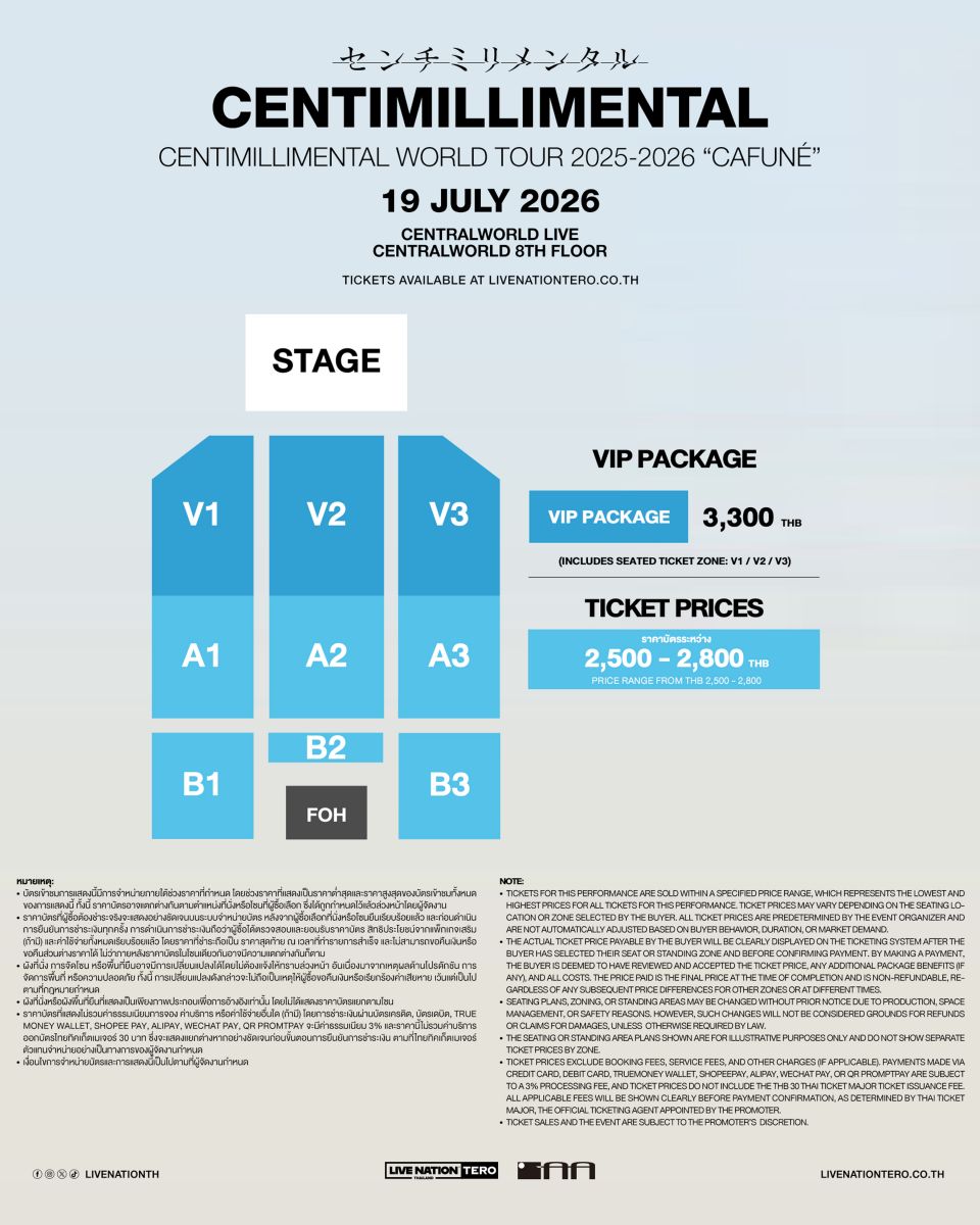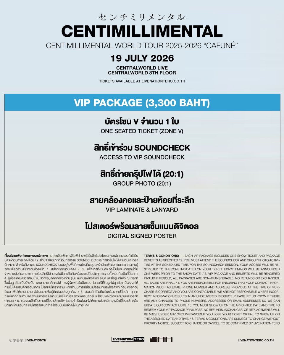 ด้วยสไตล์เพลงที่เป็นเอกลักษณ์ ทำให้ผลงานของ Centimillimental โดดเด่นกินใจแฟน ๆ มาอย่างยาวนาน ทั้งยังมีเพลงฮิตติดหูจากซีรีส์และแอนิเมชั่นมากมาย ไม่ว่าจะเป็น Given และ Bakuten!! ห้ามพลาดประสบการณ์ซึ้งตรึงใจ มาร่วมจอยประสบการณ์อบอุ่นไปกับศิลปินญี่ปุ่นที่คุณคิดถึงในคอนเสิร์ต Centimillimental WORLD TOUR 2025-2026 “Cafuné” 19 กรกฎาคมนี้ บัตรราคาเริ่มต้น 2,500 บาท