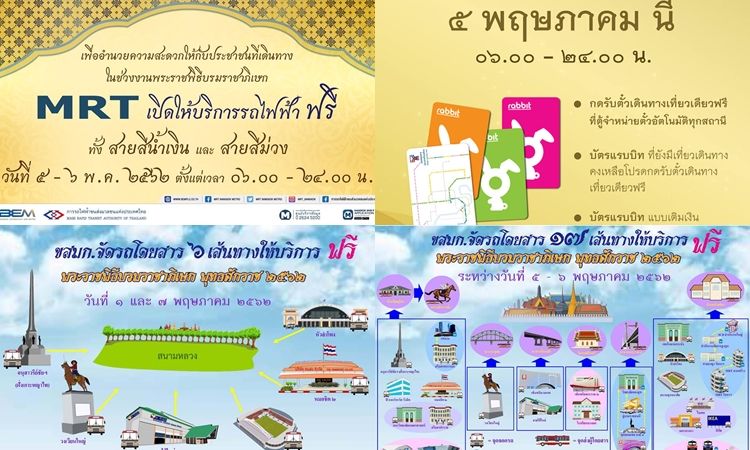 การรถไฟฟ้าขนส่งมวลชนแห่งประเทศไทย (รฟม.) และ บริษัท ทางด่วนและรถไฟฟ้ากรุงเทพ จำกัด (มหาชน) (BEM) ผู้ให้บริการรถไฟฟ้า MRT ร่วมเฉลิมพระเกียรติเนื่องในโอกาสมหามงคลพระราชพิธีบรมราชาภิเษก สมเด็จพระเจ้าอยู่หัวมหาวชิราลงกรณ บดินทรเทพยวรางกูร ขอแจ้งการเปิดให้บริการรถไฟฟ้า MRT สายเฉลิมรัชมงคล (สายสีน้ำเงิน) และรถไฟฟ้า MRT สายฉลองรัชธรรม (สายสีม่วง) ฟรี ในวันที่ 5 - 6 พ.ค.62 ตลอดระยะเวลาเปิดให้บริการ และยังเปิดให้บริการที่จอดรถฟรี ณ อาคารจอดแล้วจร สายสีน้ำเงินและสีม่วง ระหว่างวันที่ 4 – 6 พฤษภาคม 2562 นอกจากนี้ ยังมี Shuttle Bus เชื่อมต่อ ณ MRT สถานีหัวลำโพง สถานีเพชรบุรี สถานีลาดพร้าว และสถานีตลาดบางใหญ่ ระหว่างวันที่ 2- 6 พ.ค.62 เพื่ออำนวยความสะดวกให้กับประชาชนที่เดินทางในช่วงงานพระราชพิธีบรมราชาภิเษก
